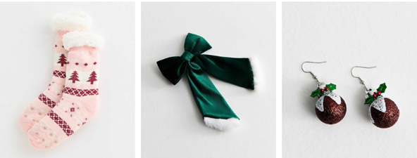 (Left to right: Pink Christmas Bootie Socks - £9.99, Bright Green Velvet Christmas Santa Bow Hair Slide - £5.99, Silver Tone Christmas Pudding Drop Earrings - £3.99)